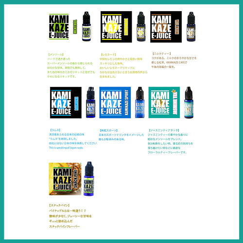 KAMIKAZE E-JUICE 15ml 商品説明 ○ 安心安全な純国内生産 ・世界に誇れる日本人ならではの味覚や嗅覚。