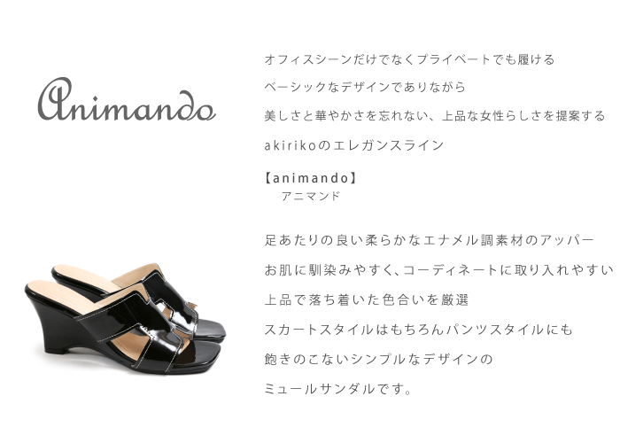 Information 商品名 animando アニマンド エナメル調 ベルトデザイン 約7.0cmウェッジソール ミュールサンダル 商品番号 na3211_b 商品コメント オフィスシーンだけでなくプライベートでも履ける ベーシックなデザインでありながら 美しさと華やかさを忘れない、上品な女性らしさを提案する akirikoのエレガンスライン 【animando】アニマンド 足あたりの良い柔らかなエナメル調素材のアッパー お肌に馴染みやすく、コーディネートに取り入れやすい 上品で落ち着いた色合いを厳選 スカートスタイルはもちろんパンツスタイルにも 飽きのこないシンプルなデザインのミュールサンダルです。