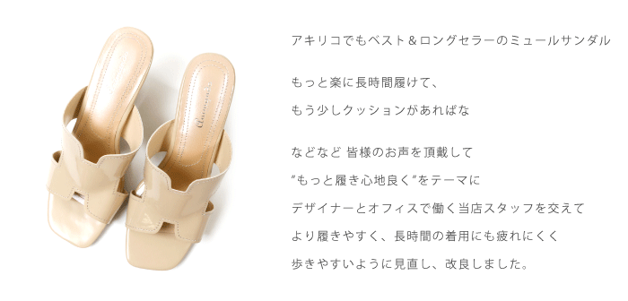 アキリコでもベスト&ロングセラーのミュールサンダル もっと楽に長時間履けて、 もう少しクッションがあればな などなど 皆様のお声を頂戴して ”もっと履き心地良く”をテーマに デザイナーとオフィスで働く当店スタッフを交えて より履きやすく、長時間の着用にも疲れにくく 歩きやすいように見直し、改良しました。